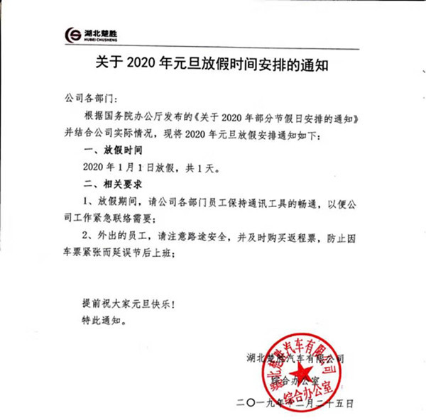 眼看2019年終將過去,新的一年也即將來臨,隨著新的一年的開始,專用車也新增了許多新規(guī),這不免給專用車購買用戶無形中增加了成本。但是,人總是要向前看,人們也昐著元旦假期的到來。湖北楚勝溫馨提醒,元旦放假通知如下: