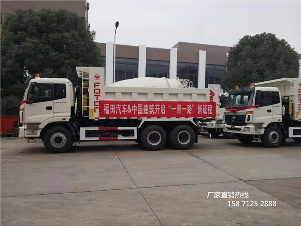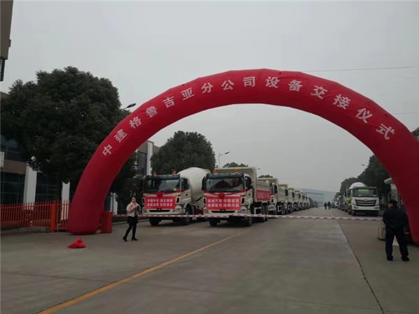自卸車、攪拌車、灑水車整裝待發(fā),氣勢磅礴。中建市政工程有限公司海外事業(yè)部副總經(jīng)理楊宏飛,福田國際戰(zhàn)略客戶行業(yè)總監(jiān)張雅靜女士順利完成交車儀式。