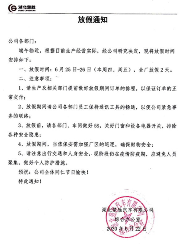 湖北楚勝端午節(jié)放假通知