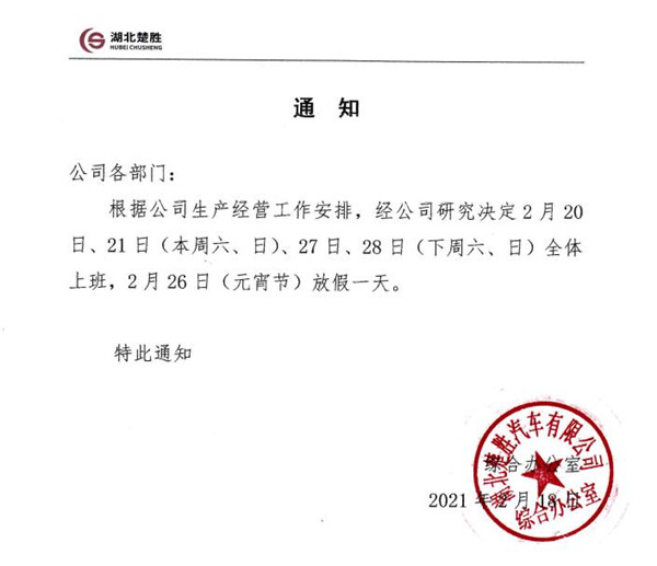 湖北楚勝汽車有限公司于正月初六開工以來,可謂是開門紅,訂單滿滿。現(xiàn)因?yàn)榱藵M足按時(shí)按量的完成各用戶的需求,公司決定,元宵節(jié)當(dāng)天放假一天,其余時(shí)間正常上班。有需要定車的用戶可以來我司實(shí)地考察和電話訂車了。咨詢熱線:158 7125 2888 (微信同號(hào))