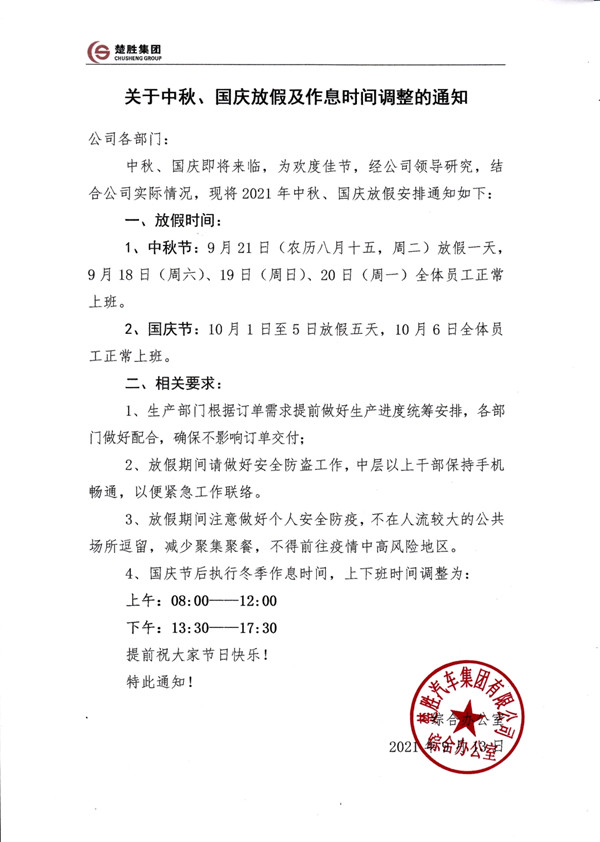 轉(zhuǎn)眼,2021年的中秋就要到了。今年,中秋過后不久,又迎來了國慶小長假,因此,經(jīng)楚勝公司領(lǐng)導(dǎo)研究決定,放假時(shí)間如下,如果有需要購車的用戶,請抓緊時(shí)間定車,以免訂車時(shí)間過長而影響你的富貴賺錢時(shí)間。