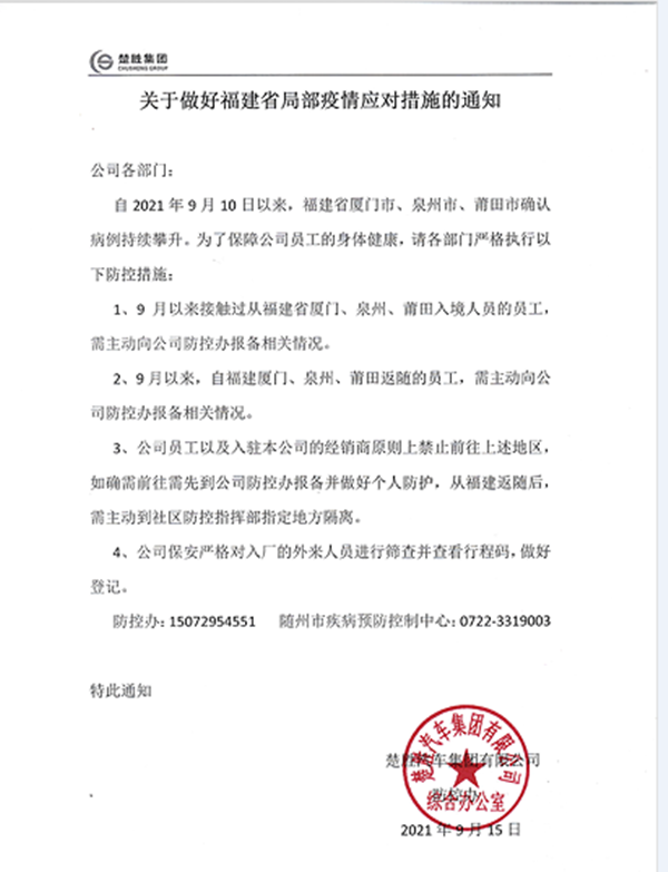 2021年的疫情是反反復(fù)復(fù),這可我們的生活及出行或多或少的帶來了不少的不便。這不,國內(nèi)疫情剛有所好轉(zhuǎn),福建的疫情又嚴(yán)重了,而這次疫情,又臨近中秋和國慶節(jié)小長假,疫情防控就顯得特別重要了。湖北楚勝就疫情把控采取了以下措施,讓我們一起來看看吧!