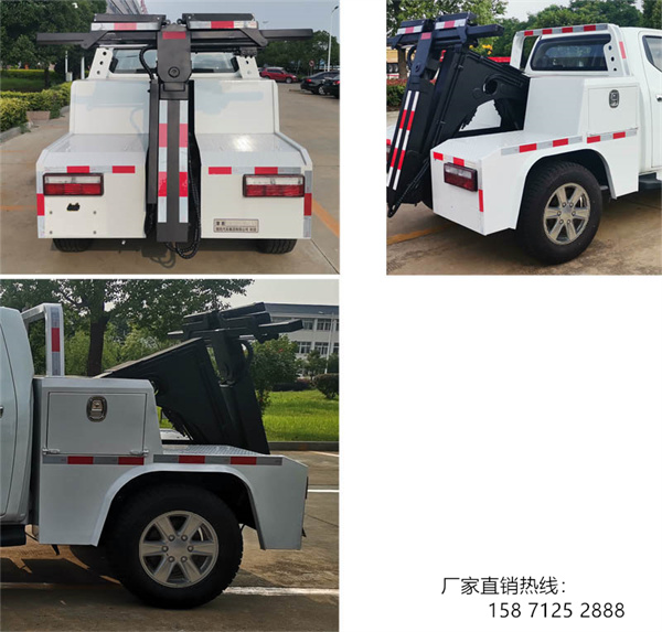 CSC5030TQZJW6型清障車又叫五十鈴地庫皮卡一拖一清障車,該車采用JXW1031CSJ底盤改裝而成。楚勝集團(tuán)皮卡清障車是在貨箱結(jié)構(gòu)不變的情況下,在貨箱底部加裝液壓托臂,加裝1套液壓升降輔助輪,兩縱樑用鋼板加強(qiáng),后橋加換4塊鋼板,有線及無線搖控兩種操作方式,選裝自動抱胎和手動抱胎結(jié)構(gòu),托舉質(zhì)量約2-3噸,標(biāo)配輔助小車2臺,綁帶2條,工具箱1個,車身不超過6米(車身短),車高不超過2米(高度低),可快速到達(dá)地下車庫進(jìn)行救援,全自動夾緊裝置,托臂大有效長度1550mm,L臂可選裝自動型,最大托牽質(zhì)量1160kg,托舉質(zhì)量530kg;絞盤大拉力2268kg,該絞盤配有快放裝置,在無載荷情況下可實現(xiàn)吊鉤快放;底盤大梁為改裝加強(qiáng)型,駕駛室前端增設(shè)保險杠,加裝活動式配重,具體詳情請咨詢:158 7125 2888(微信同號)