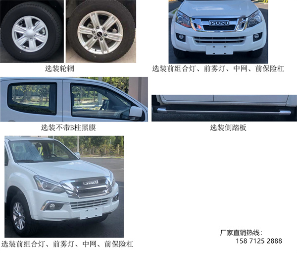 慶鈴五十鈴皮卡清障車可根據(jù)用戶選裝輪輞.選裝不帶B柱黑膜.選裝前組合燈、前霧燈、中網(wǎng)、前保險杠.選裝側(cè)踏板.選裝龍門架及工具箱.