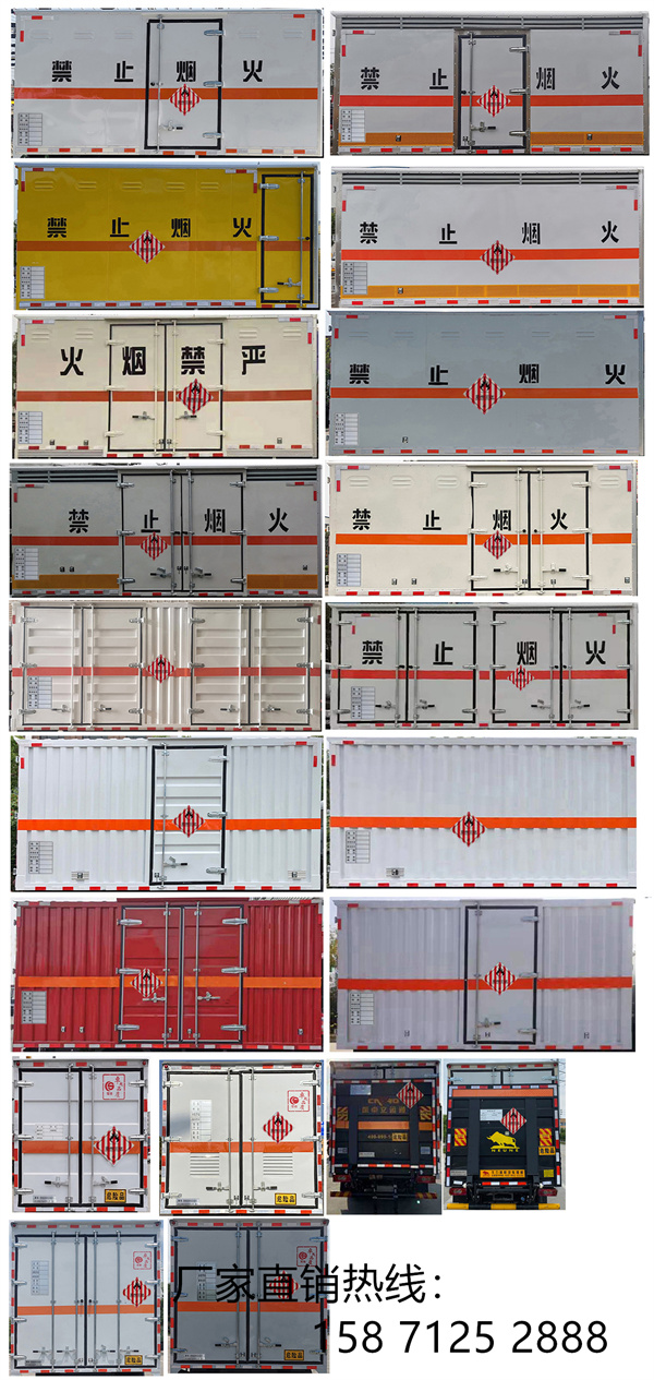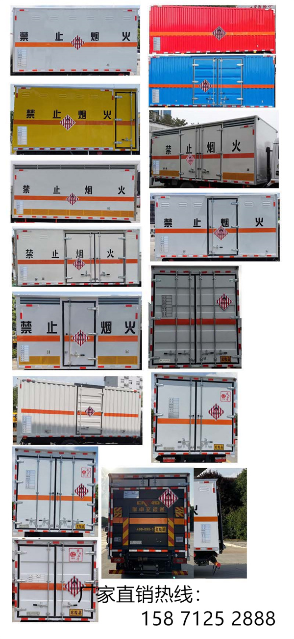 CSC5045XRGB6型易燃固體廂式運(yùn)輸車(chē)又叫藍(lán)牌福田歐馬可易燃固體廂式運(yùn)輸車(chē),該車(chē)采用BJ1045V8JDA-FK底盤(pán)改裝而成,廂體頂部封閉,不可開(kāi)啟?筛鶕(jù)用戶(hù)選擇:廂體選裝側(cè)開(kāi)門(mén)及位置或無(wú)側(cè)門(mén)、選裝后門(mén)雙拉桿,廂體選裝瓦楞板結(jié)構(gòu),選裝百葉窗。選裝制冷機(jī)組,選裝儲(chǔ)氣筒樣式。該車(chē)用于運(yùn)輸危險(xiǎn)品運(yùn)輸車(chē),運(yùn)輸具有獨(dú)立容器(瓶)包裝的物品,運(yùn)送危險(xiǎn)物品類(lèi)項(xiàng)號(hào):4.1,4.2,4.3。具體詳情請(qǐng)咨詢(xún):158 7125 2888(微信同號(hào))