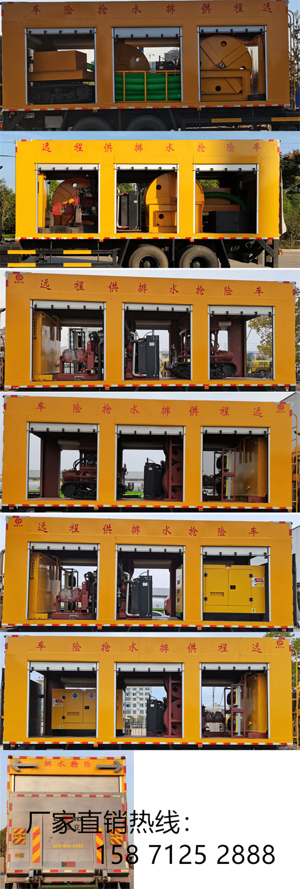 CSC5200TGPD6型遠程供排水搶險車又叫東風天龍后雙橋遠程供排水搶險車,該車采用DFH1250D4底盤改裝而成,車廂頂部封閉不可開啟。該車可根據(jù)用戶選裝:選裝遠程排水泵樣式,選裝液壓油管、卷盤樣式,選裝散熱器機組,選裝后部作業(yè)燈具,后部作業(yè)燈具僅用于作業(yè)狀態(tài)下使用,車輛行駛過程中關(guān)閉。該車主要專用裝置有遠程供排水泵、液壓尾板,用于應(yīng)急供排水搶險作業(yè)。具體詳情請咨詢:189 7299 9755(微信同號)