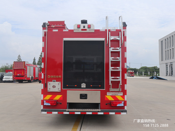 罐體總容積為6.600立方米,水罐容積:4.500立方米,水罐尺寸:2165×1400×1550mm,泡沫液罐容積:2.100立方米,泡沫液罐尺寸:1000×1400×1550mm。整體式側防護結構,后防護裝置材料:Q235A,截面尺寸:100×120mm,與車輛連接方式:螺栓連接,后防護離地高度:445mm。EBS生產企業(yè)為WABCO,型號為480 020 XXX0。主要專用裝置有消防泵、消防炮。 | ||