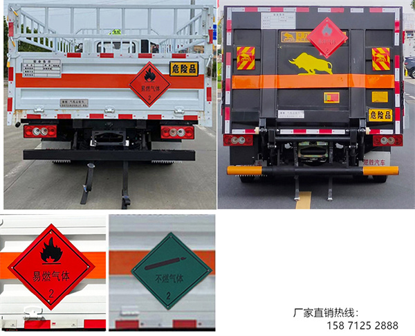 該車適用于運輸危險品,用于運輸具有獨立容器(瓶)包裝的物品,運送危險類項號:2.1,2.2.運輸易燃氣體時掛2.1類警示牌,運輸非易燃無毒氣體時掛2.2類警示牌.側(cè)、后防護材料均為Q235,螺栓連接,后防護截面尺寸(mm)φ100,下邊緣離地高430mm.液壓尾板收起狀態(tài)水平長度為280mm,尾板質(zhì)量為350kg.選裝后部無尾板時,后防護材料為Q235,螺栓連接,截面尺寸(mm)100×50,下邊緣離地高430mm.僅選用排氣管前置、限速裝置(限速80km/h)、前輪盤式制動及子午線輪胎的底盤;轉(zhuǎn)向輪裝備輪胎爆胎應(yīng)急防護裝置.安裝帶有衛(wèi)星定位功能的行駛記錄儀.ABS系統(tǒng)控制方式為4S/4M,氣剎:ABS型號為CM4XL-4S/4M,生產(chǎn)廠家為廣州瑞立科密汽車電子股份有限公司.液剎:ABS型號為CM4YL,生產(chǎn)廠家為廣州瑞立科密汽車電子股份有限公司.液剎:ABS型號為CM0953YL,生產(chǎn)廠家為廣州瑞立科密汽車電子股份有限公司.發(fā)動機/油耗值(L/100Km)對應(yīng)關(guān)系為:Q23-115C60/11.40,Q23-115E60/11.12,Q23-132E60/11.17.僅選用軸距2850mm.整車外形尺寸長/后懸對應(yīng)關(guān)系為(mm):5540/1560,5450/1470,5250/1270.選裝直接供電式ETC車載裝置.整備質(zhì)量不含備胎,包含滅火器及隨車工具;貨箱重量540kg,480kg,貨箱材質(zhì)/厚度:底板Q235/3mm,槽鋼/2.5mm;墻板Q235/1mm.選裝尾板樣式. | ||