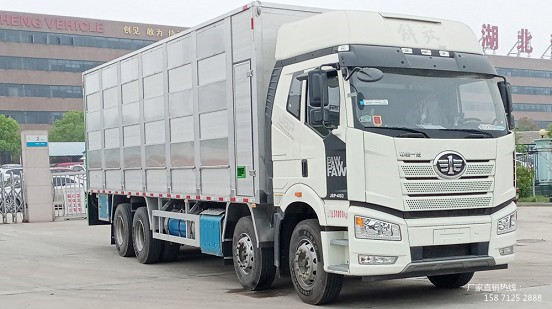 該車專用裝置為箱體,主要用于畜禽運輸。車廂底板至頂部高度2550mm。尾板收起狀態(tài)水平長度為250mm,尾板質量為450kg。側防護材料為鋁合金,螺栓連接,后防護材料為Q235,螺栓連接,斷面尺寸(mm):120×80,下緣離地高500mm。安裝有具有衛(wèi)星定位功能的行駛記錄儀。隨底盤選裝駕駛室,選裝制冷機,選裝箱體前部不帶設備艙樣式,選裝多層及多隔艙樣式。ABS系統(tǒng)控制器型號/生產(chǎn)企業(yè):CM4XL/長春瑞立科密汽車電子有限公司。發(fā)動機/油耗值(L/100km)對應關系為:CA6DM2-46E6/37.33,CA6DM2-42E6/37.33,CA6DM2-40E6/37.33,CA6DL6-36E6/36.5,CA6DL6-38E6/36.5,CA6DM3-56E6/37.32,CA6DM3-50E6/37.32。選裝ETC。 | ||